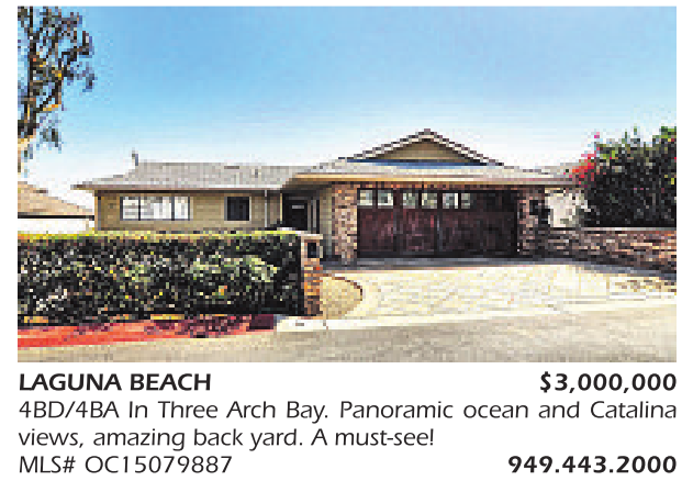 LAGUNA BEACH $3,000,000 4BD/4BA In Three Arch Bay. Panoramic ocean and Catalina views, amazing back yard. A must-see! MLS# OC15079887 949.443.2000