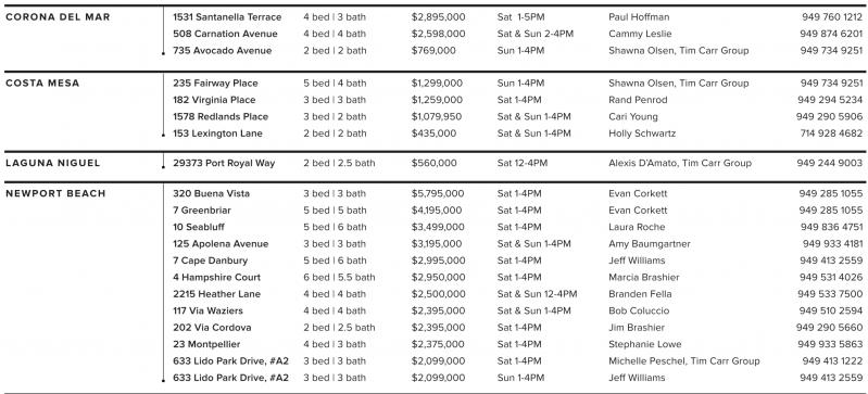 NEWPORT BEACH 320 Buena Vista 3 bed | 3 bath $5,795,000 Sat 1-4PM Evan Corkett 949 285 1055 7 Greenbriar 5 bed | 5 bath $4,195,000 Sat 1-4PM Evan Corkett 949 285 1055 10 Seabluff 5 bed | 6 bath $3,499,000 Sat 1-4PM Laura Roche 949 836 4751 125 Apolena Avenue 3 bed | 3 bath $3,195,000 Sat & Sun 1-4PM Amy Baumgartner 949 933 4181 7 Cape Danbury 5 bed | 6 bath $2,995,000 Sat 1-4PM Jeff Williams 949 413 2559 4 Hampshire Court 6 bed | 5.5 bath $2,950,000 Sat 1-4PM Marcia Brashier 949 531 4026 2215 Heather Lane 4 bed | 4 bath $2,500,000 Sat & Sun 12-4PM Branden Fella 949 533 7500 117 Via Waziers 4 bed | 4 bath $2,395,000 Sat & Sun 1-4PM Bob Coluccio 949 510 2594 202 Via Cordova 2 bed | 2.5 bath $2,395,000 Sat 1-4PM Jim Brashier 949 290 5660 23 Montpellier 4 bed | 3 bath $2,375,000 Sat 1-4PM Stephanie Lowe 949 933 5863 633 Lido Park Drive, #A2 3 bed | 3 bath $2,099,000 Sat 1-4PM Michelle Peschel, Tim Carr Group 949 413 1222 633 Lido Park Drive, #A2 3 bed | 3 bath $2,099,000 Sun 1-4PM Jeff Williams 949 413 2559