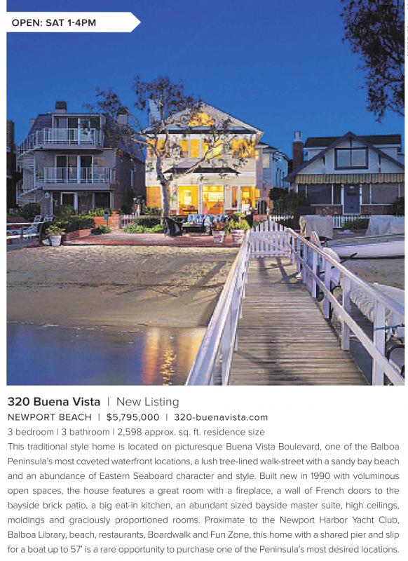 NEWPORT BEACH | $5,795,000 | 320-buenavista.com 3 bedroom | 3 bathroom | 2,598 approx. sq. ft. residence size This traditional style home is located on picturesque Buena Vista Boulevard, one of the Balboa Peninsula’s mostcoveted waterfrontlocations,alushtree-lined walk-street with asandy baybeach and an abundance of Eastern Seaboard character and style. Built new in 1990 with voluminous open spaces, the house features a great room with a fireplace, a wall of French doors to the bayside brick patio, a big eat-in kitchen, an abundant sized bayside master suite, high ceilings, moldings and graciously proportioned rooms. Proximate to the Newport Harbor Yacht Club, Balboa Library,beach,restaurants, Boardwalkand FunZone, this home with ashared pier and slip foraboat up to 57’ is arare opportunity to purchase oneofthe Peninsula’smost desiredlocations.