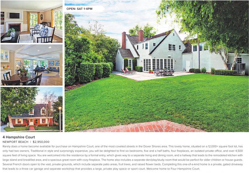 NEWPORT BEACH | $2,950,000 Rarely does a home become available for purchase on Hampshire Court, one of the most coveted streets in the Dover Shores area. This lovely home, situated on a 12,000+ square foot lot, has only had two owners. Traditional in style and surprisingly expansive, you will be delighted to find six bedrooms, five and a half baths, four fireplaces, an isolated private office, and over 4,500 square feet of living space. You are welcomed into the residence by a formal entry, which gives way to a separate living and dining room, and a hallway that leads to the remodeled kitchen with large island and breakfast area, and aspacious great room with cozy fireplace.The home also includes aseparate den/play/study room that would be perfect for older children or house guests. Several French doors open to the vast, private grounds, which include separate patio areas, fruit trees, and raised flower beds. Completing this one-of-a-kind home is a private, gated driveway that leads to a three car garage and separate workshop that provides a large, private play space or sport court. Welcome home to Four Hampshire Court.