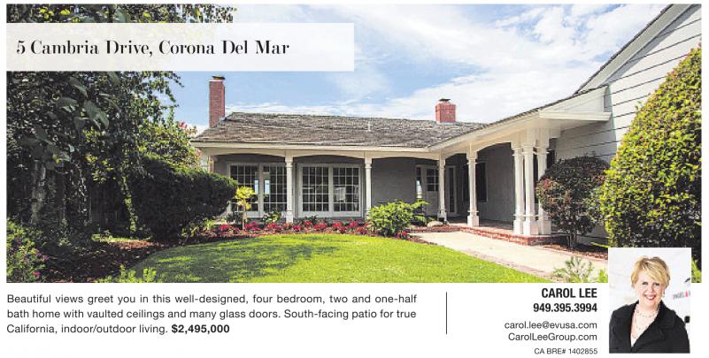 5 Cambria Drive, Corona Del Mar Beautiful views greet you in this well-designed, four bedroom, two and one-half bath home with vaulted ceilings and many glass doors. South-facing patio for true California, indoor/outdoor living. $2,495,000 CAROL LEE 949.395.3994 carol.lee@evusa.com CarolLeeGroup.com CA BRE# 1402855