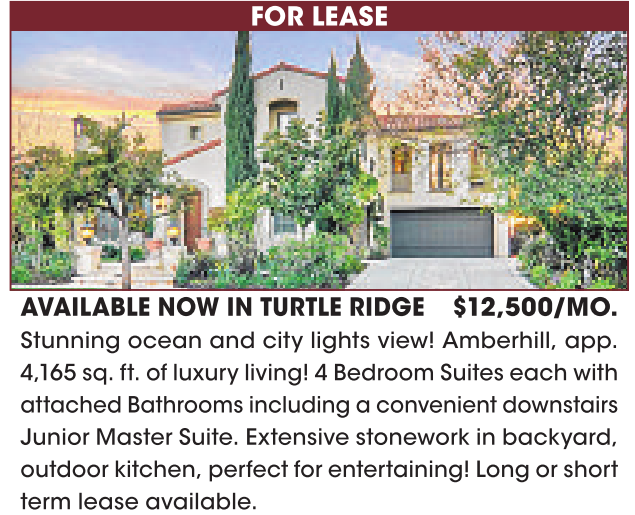 AVAILABLE NOW IN TURTLE RIDGE $12,500/MO. Stunning ocean and city lights view! Amberhill, app. 4,165 sq. ft. of luxury living! 4 Bedroom Suites each with attached Bathrooms including aconvenient downstairs Junior Master Suite. Extensive stonework in backyard, outdoor kitchen, perfect for entertaining! Long or short term lease available.
