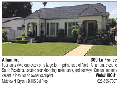 Alhambra 309 La France Fourunits (two duplexes) on alarge lotinprime area of North Alhambra, close to South Pasadena. Locatednearshopping, restaurants,and freeways. One unit recently vacant is ideal for an owner occupant. Web# HIQU1 Matthew N. Bryant /BHHS Cal Prop 626-695-7807