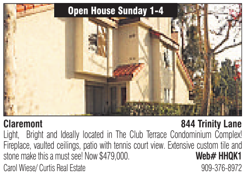 Open House Sunday 1-4 Claremont 844 Trinity Lane Light, Bright and Ideally located in The Club Terrace Condominium Complex! Fireplace, vaulted ceilings, patio with tennis court view. Extensive custom tile and stone make this amust see! Now$479,000. Web# HHQK1 Carol Wiese/ Curtis Real Estate 909-376-8972