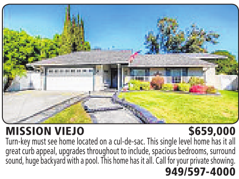 MISSION VIEJO $659,000 Turn-key mustsee home locatedonacul-de-sac. This single levelhome hasitall great curb appeal,upgrades throughouttoinclude,spaciousbedrooms,surround sound, huge backyard with apool. This home has it all. Call foryour private showing. 949/597-4000