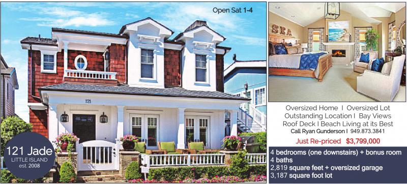 Open Sat 1-4 121 Jade LITTLE ISLAND est. 2008 Oversized Home I Oversized Lot Outstanding Location I Bay Views Roof Deck I Beach Living at its Best Call Ryan Gunderson I 949.873.3841 Just Re priced $3,799,000 4 bedrooms (one downstairs) + bonus room 4 baths 2,819 square feet + oversized garage 3,187 square foot lot See also