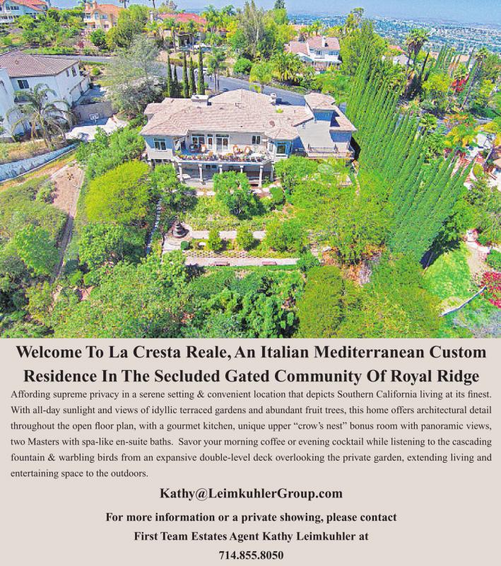 Welcome To La Cresta Reale, An Italian Mediterranean Custom Residence In The Secluded Gated Community Of Royal Ridge Affording supreme privacy in a serene setting & convenient location that depicts Southern California living at its finest. With all-day sunlight and views of idyllic terraced gardens and abundant fruit trees, this home offers architectural detail throughout the open floor plan, with a gourmet kitchen, unique upper “crow’s nest” bonus room with panoramic views, two Masters with spa-like en-suite baths. Savor your morning coffee or evening cocktail while listening to the cascading fountain & warbling birds from an expansive double-level deck overlooking the private garden, extending living and entertaining space to the outdoors. Kathy@LeimkuhlerGroup.com For more information or a private showing, please contact First Team Estates Agent Kathy Leimkuhler at 714.855.8050