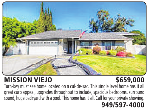 MISSION VIEJO $659,000 Turn-key mustsee home locatedonacul-de-sac. This single levelhome hasitall great curb appeal,upgrades throughouttoinclude,spacious bedrooms,surround sound, huge backyard with apool. This home has it all. Call foryour private showing. 949/597-4000 See also
