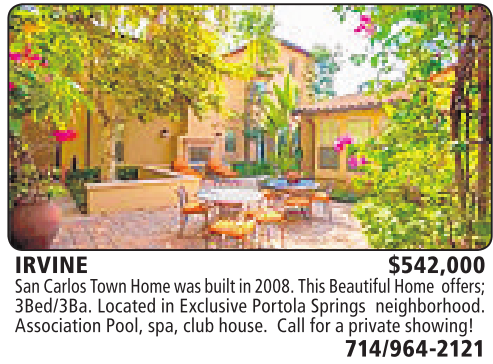 IRVINE $542,000 SanCarlosTownHome wasbuilt in 2008.ThisBeautifulHome offers; 3Bed/3Ba. Located in Exclusive Portola Springs neighborhood. AssociationPool, spa, club house. Call for aprivateshowing!