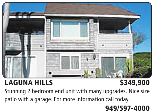 LAGUNA HILLS $349,900 Stunning 2bedroom end unit with many upgrades. Nice size patiowithagarage. For more informationcalltoday.
