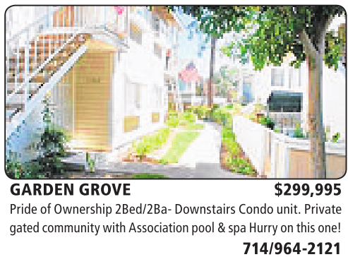 GARDEN GROVE $299,995 PrideofOwnership 2Bed/2Ba-DownstairsCondounit. Private gatedcommunitywithAssociationpool&spa Hurry on this one!
