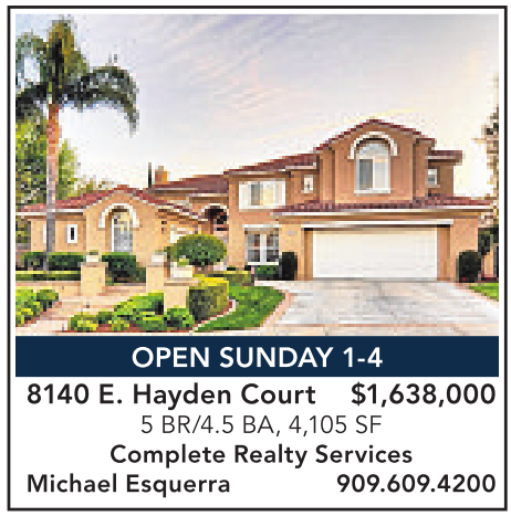 OPEN SUNDAY 1-4 8140 E. Hayden Court $1,638,000 5 BR/4.5 BA, 4,105 SF Complete Realty Services Michael Esquerra 909.609.4200