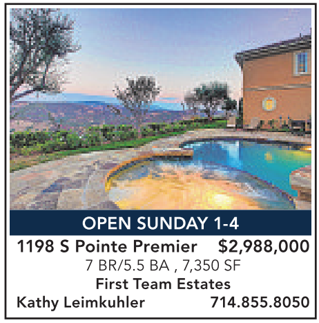 OPEN SUNDAY 1-4 1198 S Pointe Premier $2,988,000 7 BR/5.5 BA , 7,350 SF First Team Estates Kathy Leimkuhler 714.855.8050