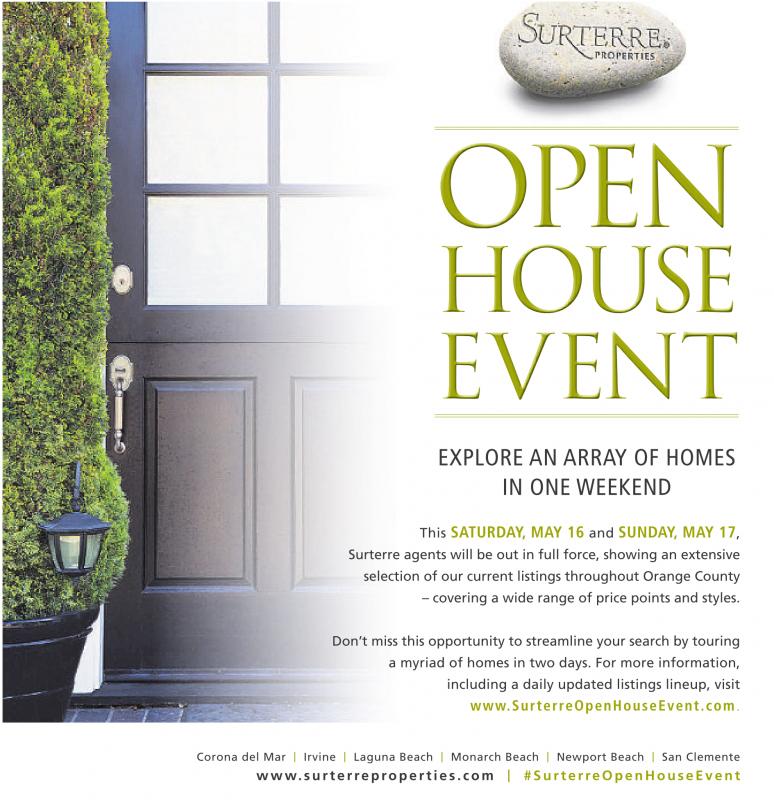 EXPLORE AN ARRAY OF HOMES IN ONE WEEKEND This SATURDAY, MAY 16 and SUNDAY, MAY 17, Surterre agents will be out in full force, showing an extensive selection of our current listings throughout Orange County – covering a wide range of price points and styles. Don’t miss this opportunity to streamline your search by touring a myriad of homes in two days. For more information, including a daily updated listings lineup, visit www.SurterreOpenHouseEvent.com. Corona del Mar | Irvine | Laguna Beach | Monarch Beach | Newport Beach | San Clemente www.surterreproperties.com | #SurterreOpenHouseEvent
