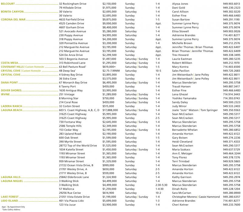 BELCOURT ......................................................... 32 Rockingham Drive $2,150,000 Sunday 1-4 Alyssa Jones 949.903.6013 79 Hillsdale Drive $1,975,000 Sunday 1-4 Dani Gold 949.230.2323 BONITA CANYON.............................................. 30 Valerio $2,695,000 Saturday 1-4 Carol Allison 949.302.0220 30 Valerio $2,695,000 Sunday 1-4 Esther Fine 949.466.6483 CORONA DEL MAR........................................... 4633 Fairfield Drive $9,875,000 Sunday 1-5 Susan Bartow 949.291.1190 4525 Camden Drive $9,000,000 Sunday Appt. Summer Lynne Perry 949.375.9074 4607 Gorham Drive $8,400,000 Sunday 1-4 Summer Lynne Perry 949.375.9074 521 Avocado Avenue $5,280,000 Saturday 1-4 Eliisa Stowell 949.903.0026 230 Poppy Avenue $4,995,000 Saturday 1-4 Adrienne Brandes 714.401.8277 318 Poppy Avenue $4,200,000 Sunday Appt. Summer Lynne Perry 949.375.9074 320 Poinsettia Avenue $3,200,000 Sunday 1-4 Michelle Brown 949.212.2576 212 Marguerite Avenue $3,195,000 Saturday Appt. Jennifer Thomas | Brian Thomas 949.422.6407 212 Marguerite Avenue $3,195,000 Sunday Appt. Brian Thomas | Jennifer Thomas 949.422.6409 524 De Anza Drive $2,299,500 Sunday Appt. Trev Howard 949.338.3495 503.5 Begonia Avenue $1,497,000 Saturday | Sunday 1-4 Laurie Eastman 949.280.5235 COSTA MESA..................................................... 313 Robinhood Lane $1,295,000 Saturday | Sunday 1-4 Robert Milliken 949.212.1970 COVENANT HILLS | CustomHomesite .................. 63 Bell Pasture Road * $619,000+ Saturday | Sunday 1-5 Mary Kontra 714.403.6500 CRYSTAL COVE | CustomHomesite ...................... 48 Deep Sea * $2.75-7.99MM Saturday 10-5 Sales Pavilion 949.720.2683 CRYSTAL COVE.................................................. 4 Sidney Bay Drive $3,895,000 Sunday 1-4 Jim Weisenbach | Jane Polley 949.422.8611 36 Sidra Cove $3,575,000 Sunday 1-4 Jim Weisenbach | Jane Polley 949.422.8611 DANA POINT..................................................... 67 Monarch Bay Drive $6,495,000 Saturday | Sunday 1-4 Marcus Skenderian 949.295.5758 6 Tawny Port $459,000 Sunday 1-4 Traudi Hansen 949.887.3417 DOVER SHORES................................................. 1630 Antigua Way $3,995,000 Saturday 1-4 Esther Fine 949.466.6483 IRVINE................................................................ 251 Vintage $1,289,000 Saturday | Sunday 1-4 Lena Ghezel 714.914.3443 8 Morning Star $750,000 Saturday | Sunday 1-4 Yoshiko Yamanaka 714.393.0743 214 Coral Rose $459,000 Saturday | Sunday 1-4 Sandy Daley 949.500.2323 LADERA RANCH................................................ 32 Corbin Street $515,000 Sunday 1-4 Judy Minor 949.533.2403 LAGUNA BEACH................................................ 603 S. Coast Highway, A,B, C, D $17,888,000 Saturday | Sunday 1-4 Joele "JoJo" Watson | Tom Springer 949.350.9363 31625 Coast Highway $5,995,000 Saturday 1-4 Sean McCracken 949.290.5317 31625 Coast Highway $5,995,000 Sunday 2-5 Sean McCracken 949.290.5317 730 Fontana Way $2,645,000 Saturday | Sunday 1-4 Marcus Skenderian 949.295.5758 2586 Temple Hills $2,349,000 Saturday 1-4 Marcus Skenderian 949.295.5758 153 Cedar Way $2,195,000 Saturday | Sunday 1-4 Bernadette Whelan 949.280.6852 283 Upland Road $2,190,000 Sunday 1-4 Amanda Horton 949.422.6122 600 Oak Street $1,599,000 Saturday 1-5 Gary Boisen 949.274.2236 390 Myrtle Street $1,595,000 Saturday 1-4 Heidi Cleveland 949.371.4333 28772 Top of the World Drive $1,525,000 Saturday 1-4 Sean McCracken 949.290.5317 1034 Katella Street $1,450,000 Saturday | Sunday 1-4 Maria Szakacs 949.637.5729 1193 Miramar Street $1,365,000 Saturday 1-4 Ann E. Metzger 949.464.3244 1193 Miramar Street $1,365,000 Sunday 1-4 Tony Florez 949.378.7276 959 Miramar Street $1,329,000 Sunday 1-4 Terri Trinidad 949.929.5865 21722 Ocean Vista Drive, B $999,000 Sunday 1-4 Marcus Skenderian 949.295.5758 21701 Wesley Drive, A $650,000 Saturday 2-5 Amanda Horton 949.422.6122 21711 Wesley Drive, B $559,000 Saturday 2-5 Amanda Horton 949.422.6122 LAGUNA HILLS.................................................. 25842 Elderbrook Lane $1,324,900 Saturday 1-4 Kathy Garrison 949.293.2974 LAGUNA NIGUEL.............................................. 3 Walking Stick $4,499,000 Saturday 1-4 Marcus Skenderian 949.295.5758 3 Walking Stick $4,499,000 Sunday 2:30-5:30 Marcus Skenderian 949.295.5758 57 Mallorca $1,259,000 Sunday 1-4:30 Dinah Roitz 949.228.1204 29256 Rue Cerise $614,900 Saturday 10-2 Sara McCartan 949.280.8900 LAKE FOREST .................................................... 21351 Vista Estate Drive $1,199,000 Saturday | Sunday 1-4 Christopher Moreno | Cassie Hammond 949.280.6357 LIDO ISLAND ..................................................... 401 Via Piazza Lido $5,699,000 Sunday 1-3 Adrienne Brandes 714.401.8277 123 Via Jucar $3,900,000 Sunday 1-4 Cheri Ketner 949.233.7600