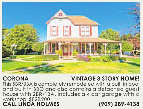 This 5BR/3BA is completely remodeled with abuilt in pool and built in BBQ and also contains adetached guest house with 2BR/1BA. Includes a 4 car garage with a workshop. $829,900 CALL LINDA HOLMES (909) 289-4138