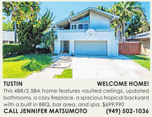 This 4BR/2.5BA home features vaulted ceilings, updated bathrooms, acozyfireplace,aspacious tropical backyard with abuilt in BBQ, bar area, and spa. $699,990 CALL JENNIFER MATSUMOTO (949) 502-1036