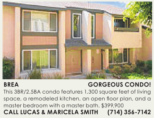 This 3BR/2.5BA condo features 1,300 square feet ofliving space, aremodeled kitchen, an open floor plan, and a master bedroom with amaster bath. $399,900 CALL LUCAS &MARICELA SMITH (714) 356-7142