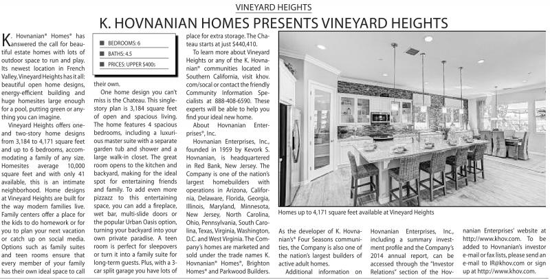 . Hovnanian® Homes® has answered the call for beautiful estate homes with lots of outdoor space to run and play. Its newest location in French Valley,VineyardHeightshas it all: beautiful open home designs, energy-efficient building and huge homesites large enough forapool,putting green or anythingyou can imagine.