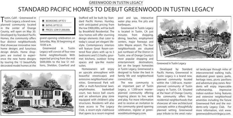 Calif. - greenwood in Tustin Legacy, abrand new, planned community located in the center of Orange County, will open on may 30. Developed by standard Pacific Homes, the community offers four distinct neighborhoods that showcase innovative new home designs and luxurious design details. Home shoppers are invited to experience the new home designs by touring the 12 beautifully decoratedmodel homes at the