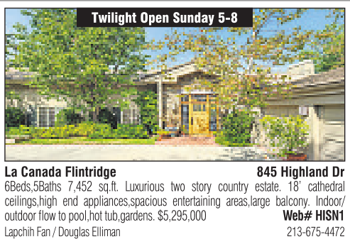 La Canada Flintridge Twilight Open Sunday 5-8 845 Highland Dr ceilings,high end appliances,spacious entertaining areas,large balcony. Indoor/ 6Beds,5Baths 7,452 sq.ft. Luxurious two story country estate. 18’ cathedral outdoorflow to pool,hottub,gardens.$5,295,000 Web# HISN1 Lapchih Fan /Douglas Elliman 213-675-4472