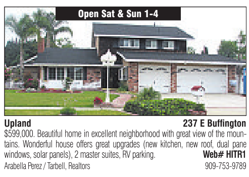 Upland Open Sat &Sun 1-4 237 EBuffington $599,000. Beautiful home in excellent neighborhood with greatviewofthe mountains. Wonderful house offers great upgrades (new kitchen, new roof, dual pane windows, solar panels),2master suites, RV parking. Web# HITR1 Arabella Perez/Tarbell,Realtors 909-753-9789