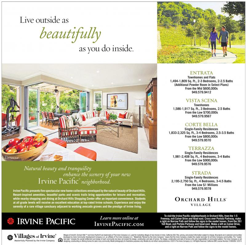 Villages of Irvine®, Orchard Hills™ and Irvine Pacific® are trademarks of The Irvine CompanyLLC,used for marketing villages of new homes in Irvine, California USA. Plan, pricing, and product information subject to change.All projects are in planned communities developed by Irvine Community Development CompanyLLC,anaffiliate of The Irvine CompanyLLC.“Masterfully Planned by the Irvine Company” means thatthe Irvine Companycreated the master land plan for all Irvine Companycommunities. The “master land plan” includes the overall entitlement and design of each community but does not include the design, construction and sale of homes. The design, construction and sale of homes is the sole responsibility of community builders. The Irvine Companyisnot designing, constructing or offering homes for sale in anycommunity.Model photographyfor illustrative purposes only.Modelsdonot reflect racial preference. ©2015 The Irvine CompanyLLC.All Rights Reserved. California BRE License Number 01889266. 5/2015