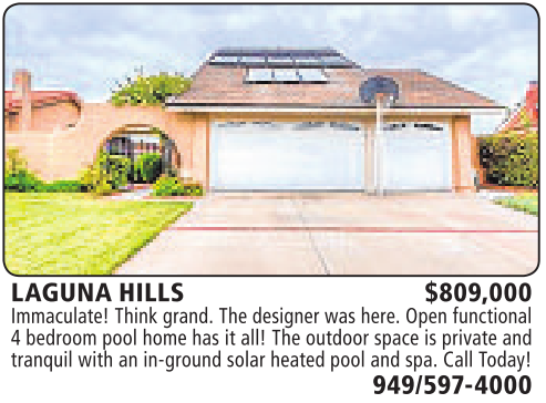 LAGUNA HILLS $809,000 Immaculate! Think grand. The designer was here. Open functional 4bedroom pool home has it all! The outdoor space is private and tranquil with anin-ground solar heated pool and spa. Call Today!