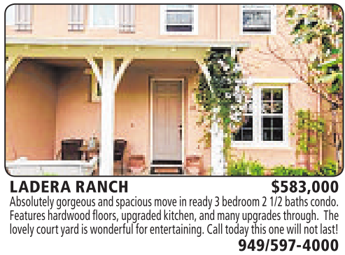 LADERA RANCH $583,000 Absolutelygorgeous and spacious move in ready3bedroom21/2 bathscondo. Features hardwood floors,upgradedkitchen,and many upgrades through. The lovely court yard is wonderfulfor entertaining. Call todaythisone will notlast!