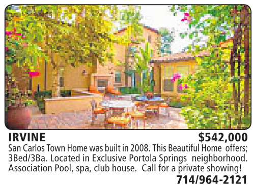 IRVINE $542,000 SanCarlosTownHome wasbuilt in 2008.ThisBeautifulHome offers; 3Bed/3Ba. Located in Exclusive Portola Springs neighborhood. AssociationPool, spa, club house. Call for aprivateshowing!