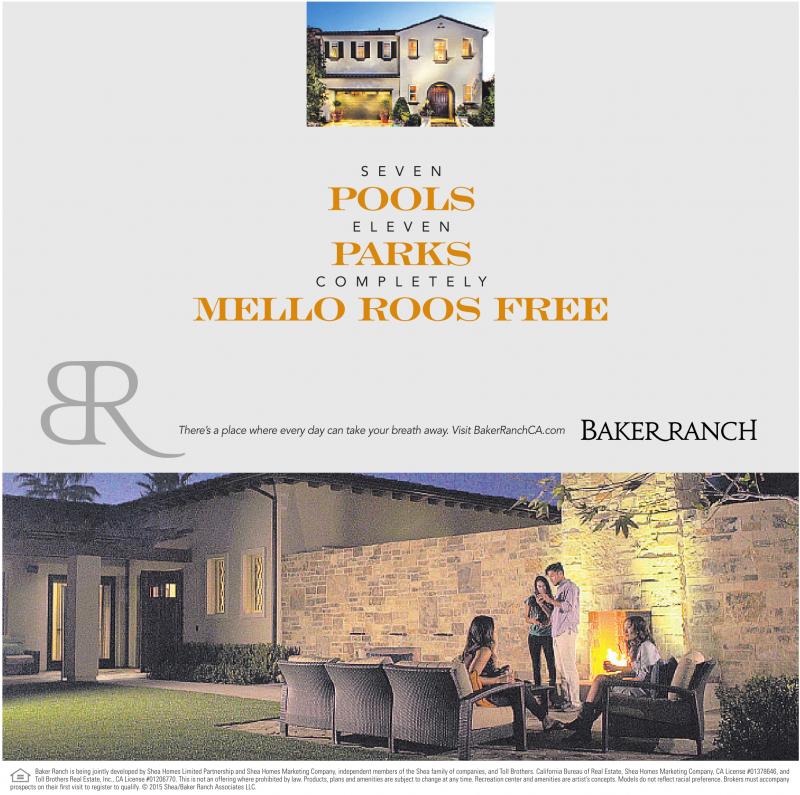 S E V E N POOLS E L E V E N PARKS C O M P L E T E L Y MELLO ROOS FREE There’s a place where every day can take your breath away. Visit BakerRanchCA.com Baker Ranch is being jointlydevelopedbySheaHomes Limited Partnershipand SheaHomes Marketing Company, independent members of theSheafamily of companies, and Toll Brothers. California Bureau of RealEstate, SheaHomes MarketingCompany,CALicense #01378646, and Toll Brothers Real Estate, Inc., CA License#01206770. Thisisnot an offering where prohibited by law.Products, plans and amenities are subject to changeatany time. Recreationcenterand amenities areartist’sconcepts. Models do not reflect racial preference. Brokers must accompany prospects on their first visit to register to qualify.©2015 Shea/BakerRanchAssociates LLC.