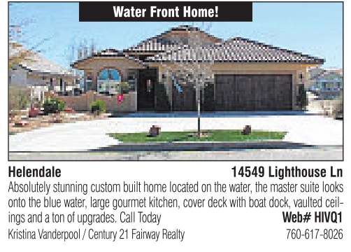 Helendale Absolutelystunning custom built homelocated on thewater,the mastersuite looks onto the blue water, large gourmet kitchen,coverdeck with boat dock, vaulted ceilings andaton of upgrades. CallToday Web# HIVQ1 Water Front Home! 14549 Lighthouse Ln Kristina Vanderpool /Century 21 Fairway Realty 760-617-8026