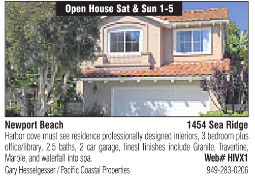 Newport Beach Open House Sat &Sun 1-5 1454 Sea Ridge Gary Hesselgesser /Pacific Coastal Properties 949-283-0206 Harborcovemustsee residence professionally designed interiors, 3bedroom plus office/library, 2.5 baths, 2 car garage, finest finishes include Granite, Travertine, Marble,and waterfallinto spa. Web# HIVX1