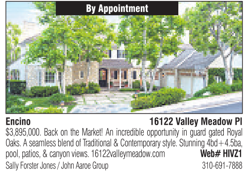 Encino By Appointment 16122 Valley Meadow Pl Sally Forster Jones /John Aaroe Group 310-691-7888 $3,895,000. Back on the Market! An incredible opportunity in guard gated Royal Oaks. Aseamlessblend of Traditional &Contemporary style.Stunning4bd+4.5ba, pool,patios, &canyon views.16122valleymeadow.com Web# HIVZ1 See also