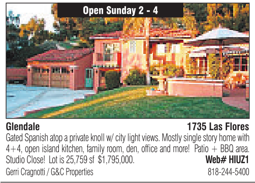 Glendale Open Sunday 2-4 1735 Las Flores Gerri Cragnotti /G&C Properties 818-244-5400 Gated Spanish atop aprivate knoll w/ city light views.Mostly single story homewith 4+4, open islandkitchen, familyroom,den,office and more! Patio +BBQ area. StudioClose! Lot is 25,759 sf $1,795,000. Web# HIUZ1 See also