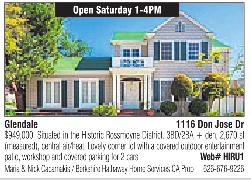 Glendale Open Saturday 1-4PM 1116 Don Jose Dr Maria &Nick Cacarnakis /BerkshireHathaway Home ServicesCAProp 626-676-9226 $949,000. Situated in the HistoricRossmoyne District. 3BD/2BA +den, 2,670 sf (measured), centralair/heat.Lovely cornerlot withacovered outdoorentertainment patio,workshop andcovered parking for2cars Web# HIRU1 See also
