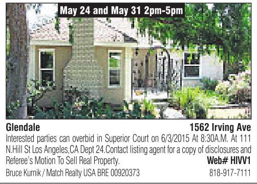 Interested parties can overbid in Superior Court on6/3/2015 At 8:30A.M. At 111 N.Hill St LosAngeles,CADept24.Contact listingagent for acopy of disclosures and