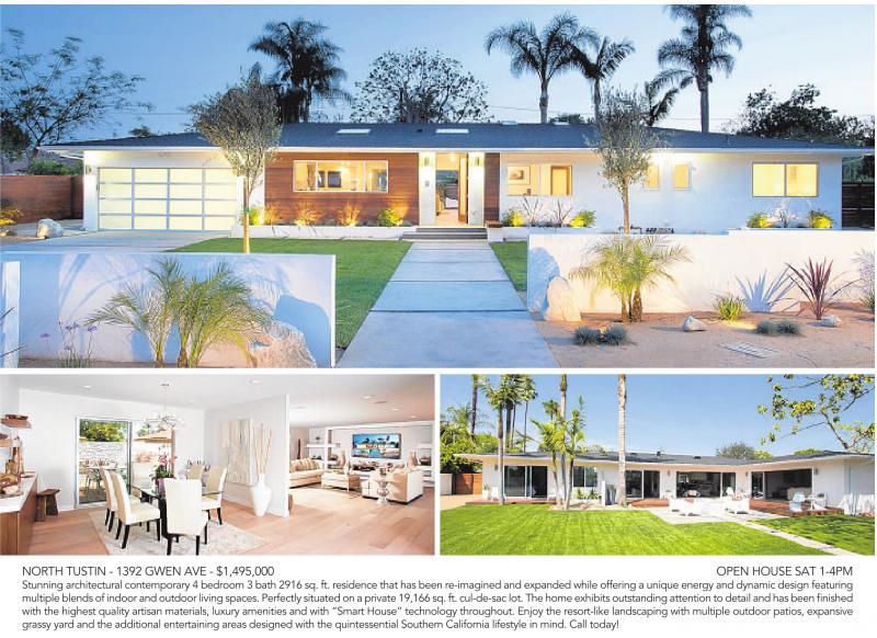 NORTH TUSTIN - 1392 GWEN AVE - $1,495,000 OPEN HOUSE SAT 1-4PM Stunning architectural contemporary4bedroom 3bath 2916sq. ft. residencethat hasbeen re-imagined andexpanded whileoffering aunique energy and dynamic design featuring multiple blends of indoor and outdoor living spaces. Perfectly situated on aprivate 19,166 sq.ft. cul-de-sac lot. The home exhibitsoutstandingattention to detailand has been finished with the highest quality artisan materials, luxury amenities and with “Smart House” technology throughout. Enjoy the resort-like landscaping with multiple outdoor patios, expansive grassy yard and the additional entertaining areas designed with the quintessential Southern California lifestyle in mind. Call today!