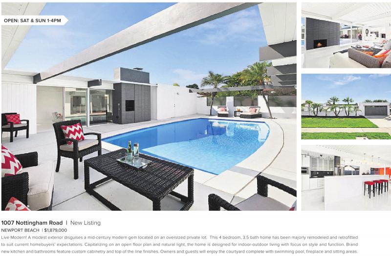 NEWPORT BEACH | $1,879,000 Live Modern! A modest exterior disguises a mid-century modern gem located on an oversized private lot. This 4 bedroom, 3.5 bath home has been majorly remodeled and retrofitted to suit current homebuyers’ expectations. Capitalizing on an open floor plan and natural light, the home is designed for indoor-outdoor living with focus on style and function. Brand new kitchen and bathrooms feature custom cabinetry and top of the line finishes. Owners and guests will enjoy the courtyard complete with swimming pool, fireplace and sitting areas.