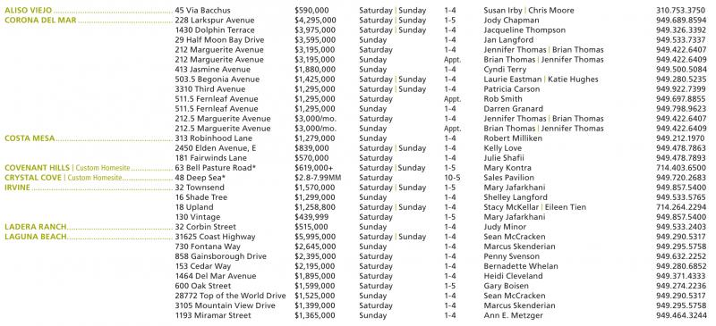 ALISO VIEJO ...................................................... 45 Via Bacchus $590,000 Saturday | Sunday 1-4 Susan Irby | Chris Moore 310.753.3750 CORONA DEL MAR ........................................... 228 Larkspur Avenue $4,295,000 Saturday | Sunday 1-5 Jody Chapman 949.689.8594 1430 Dolphin Terrace $3,975,000 Saturday | Sunday 1-4 Jacqueline Thompson 949.326.3392 29 Half Moon Bay Drive $3,595,000 Sunday 1-4 Jan Langford 949.533.7337 212 Marguerite Avenue $3,195,000 Saturday 1-4 Jennifer Thomas | Brian Thomas 949.422.6407 212 Marguerite Avenue $3,195,000 Sunday Appt. Brian Thomas | Jennifer Thomas 949.422.6409 413 Jasmine Avenue $1,880,000 Sunday 1-4 Cyndi Terry 949.500.5084 503.5 Begonia Avenue $1,425,000 Saturday | Sunday 1-4 Laurie Eastman | Katie Hughes 949.280.5235 3310 Third Avenue $1,295,000 Saturday | Sunday 1-4 Patricia Carson 949.922.7399 511.5 Fernleaf Avenue $1,295,000 Saturday Appt. Rob Smith 949.697.8855 511.5 Fernleaf Avenue $1,295,000 Sunday 1-4 Darren Granard 949.798.9623 212.5 Marguerite Avenue $3,000/mo. Saturday 1-4 Jennifer Thomas | Brian Thomas 949.422.6407 212.5 Marguerite Avenue $3,000/mo. Sunday Appt. Brian Thomas | Jennifer Thomas 949.422.6409 COSTA MESA..................................................... 313 Robinhood Lane $1,279,000 Sunday 1-4 Robert Milliken 949.212.1970 2450 Elden Avenue, E $839,000 Saturday | Sunday 1-4 Kelly Love 949.478.7863 181 Fairwinds Lane $570,000 Saturday 1-4 Julie Shafii 949.478.7893 COVENANT HILLS | Custom Homesite................... 63 Bell Pasture Road* $619,000+ Saturday | Sunday 1-5 Mary Kontra 714.403.6500 CRYSTAL COVE | CustomHomesite....................... 48 Deep Sea* $2.8-7.99MM Saturday 10-5 Sales Pavilion 949.720.2683 IRVINE................................................................ 32 Townsend $1,570,000 Saturday | Sunday 1-5 Mary Jafarkhani 949.857.5400 16 Shade Tree $1,299,000 Sunday 1-4 Shelley Langford 949.533.5765 18 Upland $1,258,800 Saturday | Sunday 1-4 Stacy McKellar | Eileen Tien 714.264.2294 130 Vintage $439,999 Saturday 1-5 Mary Jafarkhani 949.857.5400 LADERA RANCH................................................ 32 Corbin Street $515,000 Sunday 1-4 Judy Minor 949.533.2403 LAGUNA BEACH................................................ 31625 Coast Highway $5,995,000 Saturday | Sunday 1-4 Sean McCracken 949.290.5317 730 Fontana Way $2,645,000 Sunday 1-4 Marcus Skenderian 949.295.5758 858 Gainsborough Drive $2,395,000 Saturday 1-4 Penny Svenson 949.632.2252 153 Cedar Way $2,195,000 Saturday 1-4 Bernadette Whelan 949.280.6852 1464 Del Mar Avenue $1,895,000 Saturday 1-4 Heidi Cleveland 949.371.4333 600 Oak Street $1,599,000 Saturday 1-5 Gary Boisen 949.274.2236 28772 Top of the World Drive $1,525,000 Sunday 1-4 Sean McCracken 949.290.5317 3105 Mountain View Drive $1,399,000 Saturday 1-4 Marcus Skenderian 949.295.5758 1193 Miramar Street $1,365,000 Sunday 1-4 Ann E. Metzger 949.464.3244