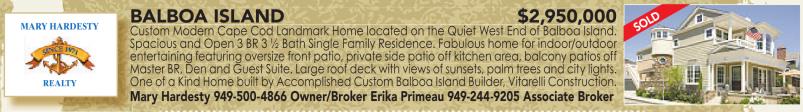 Custom Modern Cape Cod Landmark Home located on the Quiet West End of Balboa Island. Spacious and Open 3 BR 3 ½ Bath Single Family Residence. Fabulous home for indoor/outdoor entertaining featuring oversize front patio, private side patio off kitchen area, balcony patios off Master BR, Den and Guest Suite. Large roof deck with views of sunsets, palm trees and city lights. One of a Kind Home built by Accomplished Custom Balboa Island Builder, Vitarelli Construction. Mary Hardesty 949-500-4866 Owner/Broker Erika Primeau 949-244-9205 Associate Broker