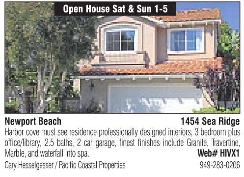 Open House Sat &Sun 1-5 Newport Beach 1454 Sea Ridge Gary Hesselgesser /Pacific Coastal Properties 949-283-0206 Harborcovemustsee residence professionally designed interiors, 3bedroom plus office/library, 2.5 baths, 2 car garage, finest finishes include Granite, Travertine, Marble,and waterfallinto spa. Web# HIVX1