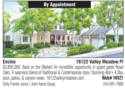 By Appointment Encino 16122 Valley Meadow Pl Sally Forster Jones /John Aaroe Group 310-691-7888 $3,895,000. Back on the Market! An incredible opportunity in guard gated Royal Oaks. Aseamlessblend of Traditional &Contemporary style.Stunning4bd+4.5ba, pool,patios, &canyon views.16122valleymeadow.com Web# HIVZ1 See also