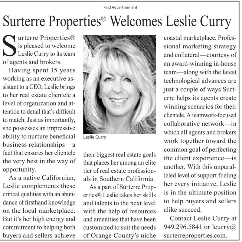 Paid Advertisement Surterre Properties ® Welcomes Leslie Curry Surterre Properties® is pleased to welcome Leslie Curry to itsteam of agents and brokers. Having spent 15 years working as an executive assistanttoaCEO,Lesliebrings to her real estate clientele a level of organization and attention to detailthat’sdifficult to match. Just as importantly, she possesses an impressive ability to nurture beneficial business relationships—a fact that ensuresher clientele the very best in the way of opportunity. As a native Californian, Leslie complements these critical qualitieswithanabundanceoffirsthandknowledge on the local marketplace. But it’s her high energy and commitment to helping both buyers and sellers achieve LeslieCurry their biggest real estate goals that places heramong an elite tier of real estate professionals in Southern California. As apartofSurterre Properties®Leslietakes herskills and talents to the next level with the help of resources and amenities that have been customized to suit the needs of Orange County’s niche coastal marketplace. Professional marketing strategy and collateral—courtesy of an award-winning in-house team—along with the latest technological advances are just a couple of ways Surterre helps its agents create winning scenarios for their clientele. Ateamwork-focused collaborative network—in which all agents and brokers work together toward the common goal of perfecting the client experience—is another. With this unparalleled level of support fueling her every initiative, Leslie is in the ultimate position to help buyers and sellers alike succeed. Contact Leslie Curry at 949.296.5841 or lcurry@ surterreproperties.com. See also