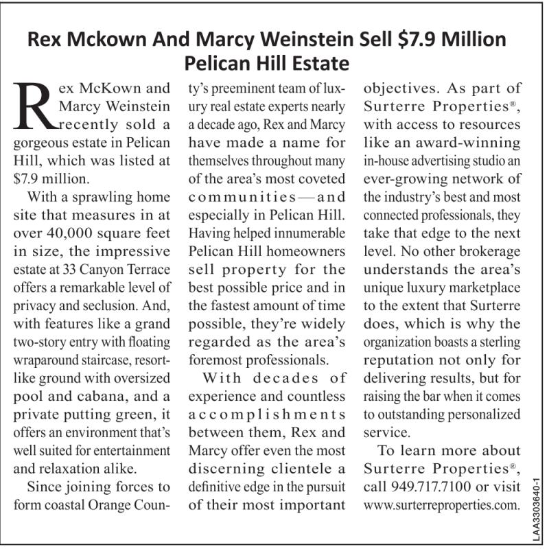 Rex Mckown And Marcy Weinstein Sell $7.9 Million Pelican Hill Estate Rex McKown and Marcy Weinstein recently sold a gorgeous estate in Pelican Hill, which was listed at $7.9 million. With a sprawling home site that measures in at over 40,000 square feet in size, the impressive estate at 33 Canyon Terrace offers a remarkable level of privacyand seclusion. And, with features like a grand two-storyentry with floating wraparoundstaircase,resortlike ground with oversized pool and cabana, and a private putting green, it offers an environmentthat’s well suited forentertainment and relaxation alike. Since joining forces to form coastal Orange Coun ty’s preeminentteamofluxuryrealestateexperts nearly adecadeago, Rexand Marcy have made a name for themselves throughout many of the area’s most coveted communities—and especially in Pelican Hill. Having helped innumerable Pelican Hill homeowners sell property for the best possible price and in the fastest amount of time possible, they’re widely regarded as the area’s foremost professionals. With decades of experience and countless a ccompl ish me nt s between them, Rex and Marcy offer even the most discerning clientele a definitive edge in thepursuit of their most important objectives. As part of Surterre Properties ® , with access to resources like an award-winning in-house advertisingstudioan ever-growing network of theindustry’sbestand most connectedprofessionals, they take that edge to the next level. No other brokerage understands the area’s unique luxury marketplace to the extent that Surterre does, which is why the organizationboastsasterling reputation not only for delivering results, but for raisingthe barwhenitcomes to outstandingpersonalized service. To learn more about Surterre Properties ® , call 949.717.7100 or visit www.surterreproperties.com.