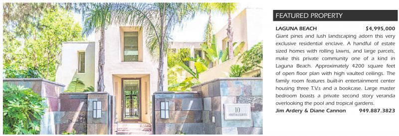 LAGUNA BEACH $4,995,000 Giant pines and lush landscaping adorn this very exclusive residential enclave. A handful of estate sized homes with rolling lawns, and large parcels, make this private community one of a kind in Laguna Beach. Approximately 4200 square feet of open floor plan with high vaulted ceilings. The family room features built-in entertainment center housing three T.V.s and a bookcase. Large master bedroom boasts a private second story veranda overlooking the pool and tropical gardens. Jim Ardery & Diane Cannon 949.887.3823