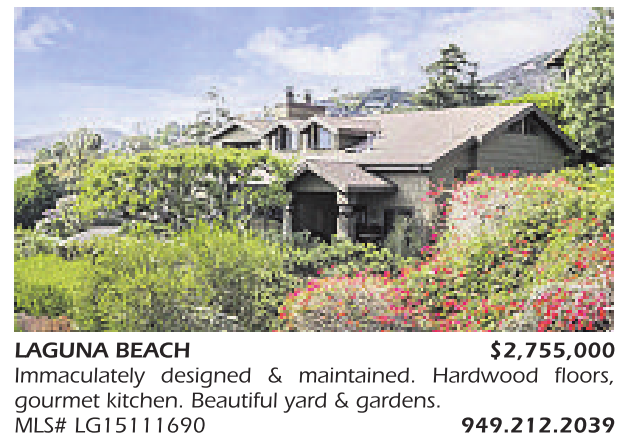 LAGUNA BEACH $2,755,000 Immaculately designed & maintained. Hardwood floors, gourmet kitchen. Beautiful yard & gardens. MLS# LG15111690 949.212.2039