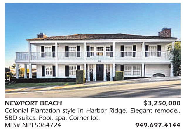 NEWPORT BEACH $3,250,000 Colonial Plantation style in Harbor Ridge. Elegant remodel, 5BD suites. Pool, spa. Corner lot. MLS# NP15064724 949.697.4144