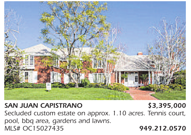 SAN JUAN CAPISTRANO $3,395,000 Secluded custom estate on approx. 1.10 acres. Tennis court, pool, bbq area, gardens and lawns. MLS# OC15027435 949.212.0570