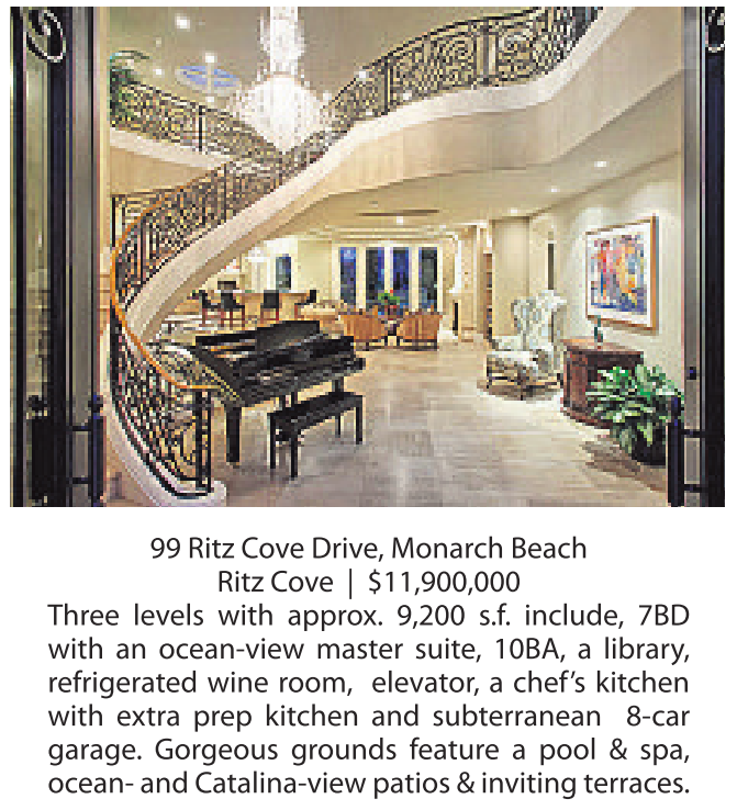 99 Ritz Cove Drive, Monarch Beach Ritz Cove | $11,900,000 Three levels with approx. 9,200 s.f. include, 7BD with an ocean-view master suite, 10BA, a library, refrigerated wine room, elevator, a chef’s kitchen with extra prep kitchen and subterranean 8-car garage. Gorgeous grounds feature a pool & spa, ocean- and Catalina-view patios &inviting terraces.